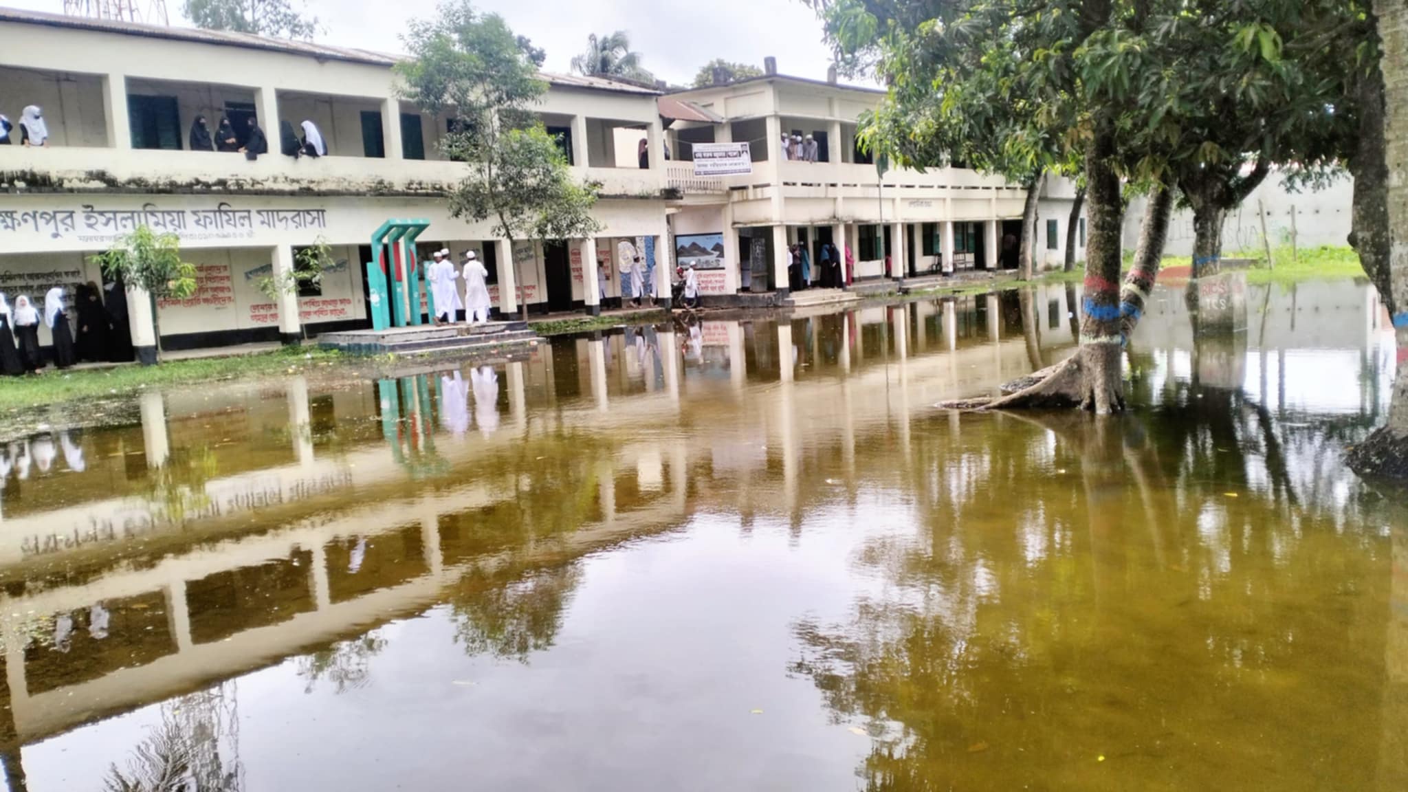 সরেজমিনে গিয়ে দেখা গেছে, কুমিল্লার মনোহরগঞ্জ উপজেলার ঐতিহ্যবাহী দ্বীনি শিক্ষা প্রতিষ্ঠান লক্ষণপুর ইসলামিয়া ফাযিল মাদরাসা। মাদরাসার পাশেই রয়েছে সড়ক, পুকুর ও বাজার। সড়ক ও বাজার থেকে মাদরাসা মাঠটি কয়েক ফুট নিচু। মাঠ নিচু হওয়ার পাশাপাশি পানি নিষ্কাশনের কোনো সুব্যবস্থা না থাকায় সামান্য বৃষ্টিতেই মাঠে জমে যায় পানি। পানিতে সাঁতার কাটছে হাঁস, খেলছে শিশুরা। জলাবদ্ধতার কারণে শিক্ষার্থীরা বারান্দা দিয়ে চলাচল করছে। কেউ কেউ হাঁটু পানি মাড়িয়ে শ্রেণিকক্ষে যাচ্ছে।